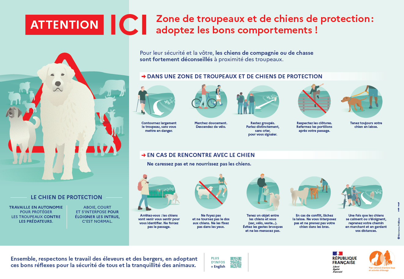 Nous vous conseillons d'éviter d’emmener votre chien de compagnie dans les secteurs où des troupeaux sont présents. Si vous l'emmenez, tenez votre chien en laisse afin qu’il ne dérange ni le troupeau, et ne soit pas perçu comme une menace potentielle par le chiens de protection. Si les chiens de protection vont vers vous, placez votre chien derrière vous.